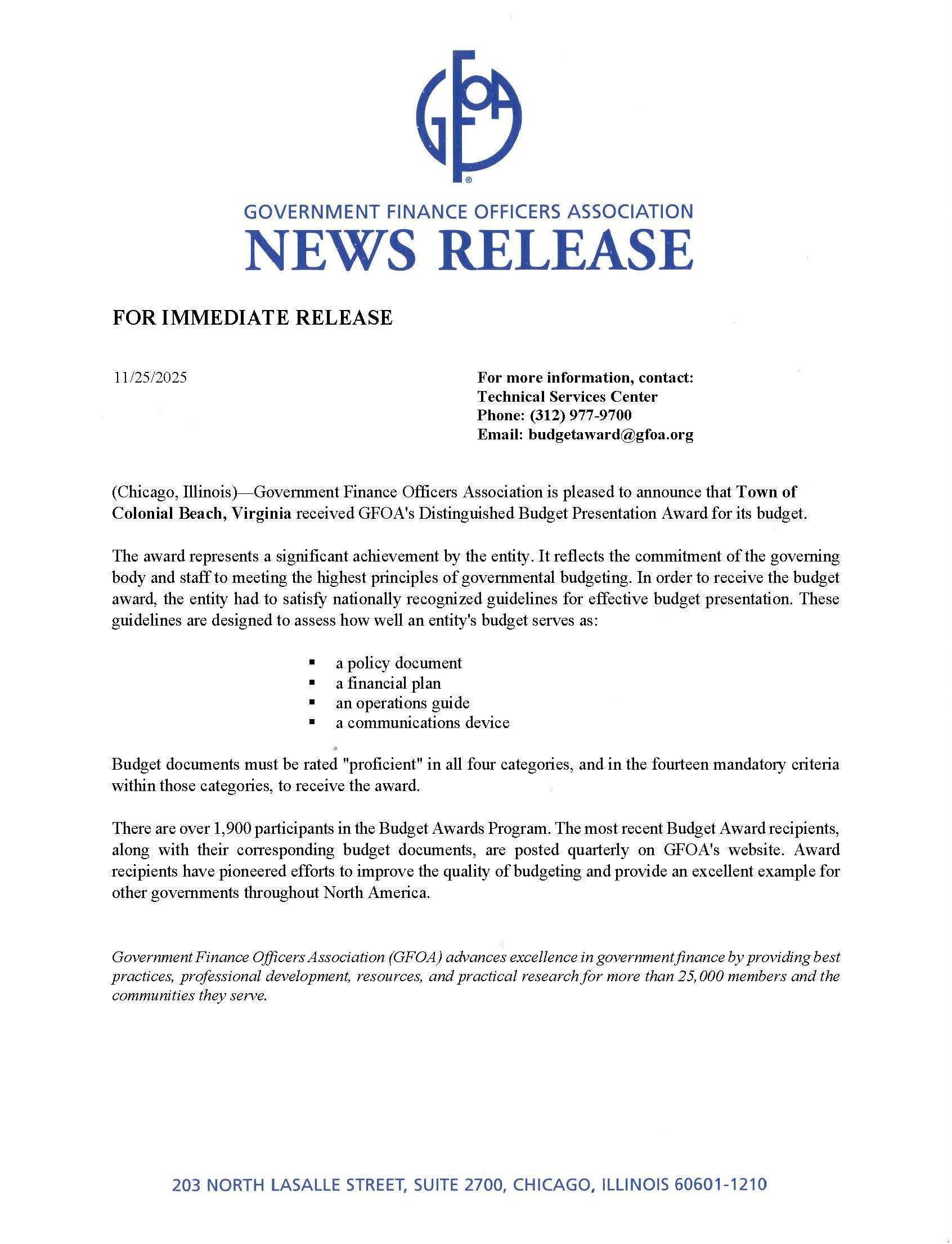 GFOA Distinguished Budget Award - Town of Colonial Beach